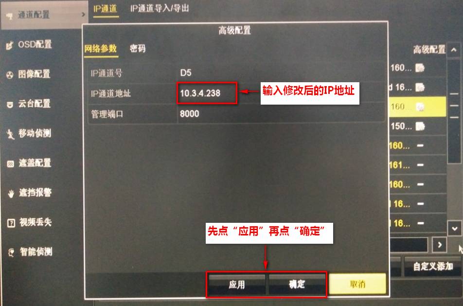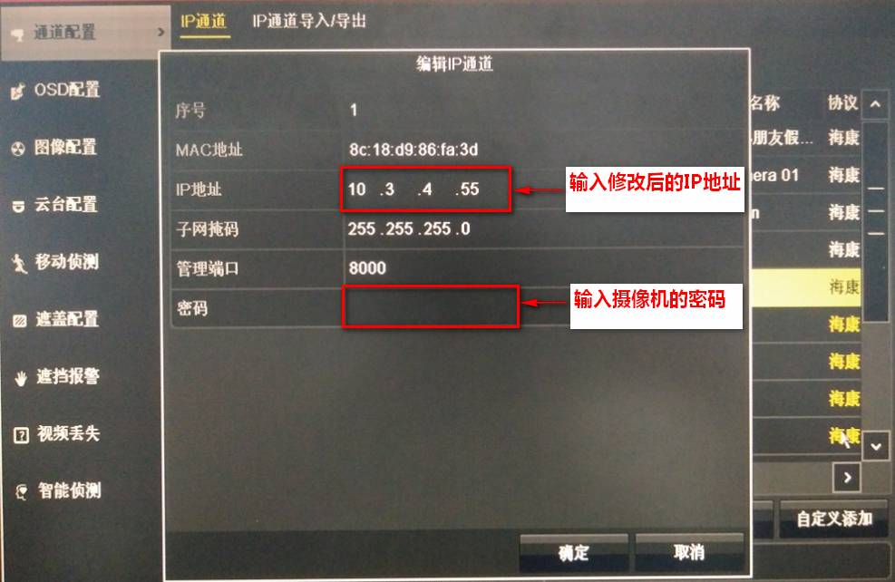 今天給大家提供兩種通過 NVR 修改攝像機IP的方法進入錄像機的主菜單—通道管理—IP通道,查看IP通道的狀態。進入編輯IP通道的界面,輸入需要修改的攝像機的IP地址,輸入攝像機正確的密碼,點確定。